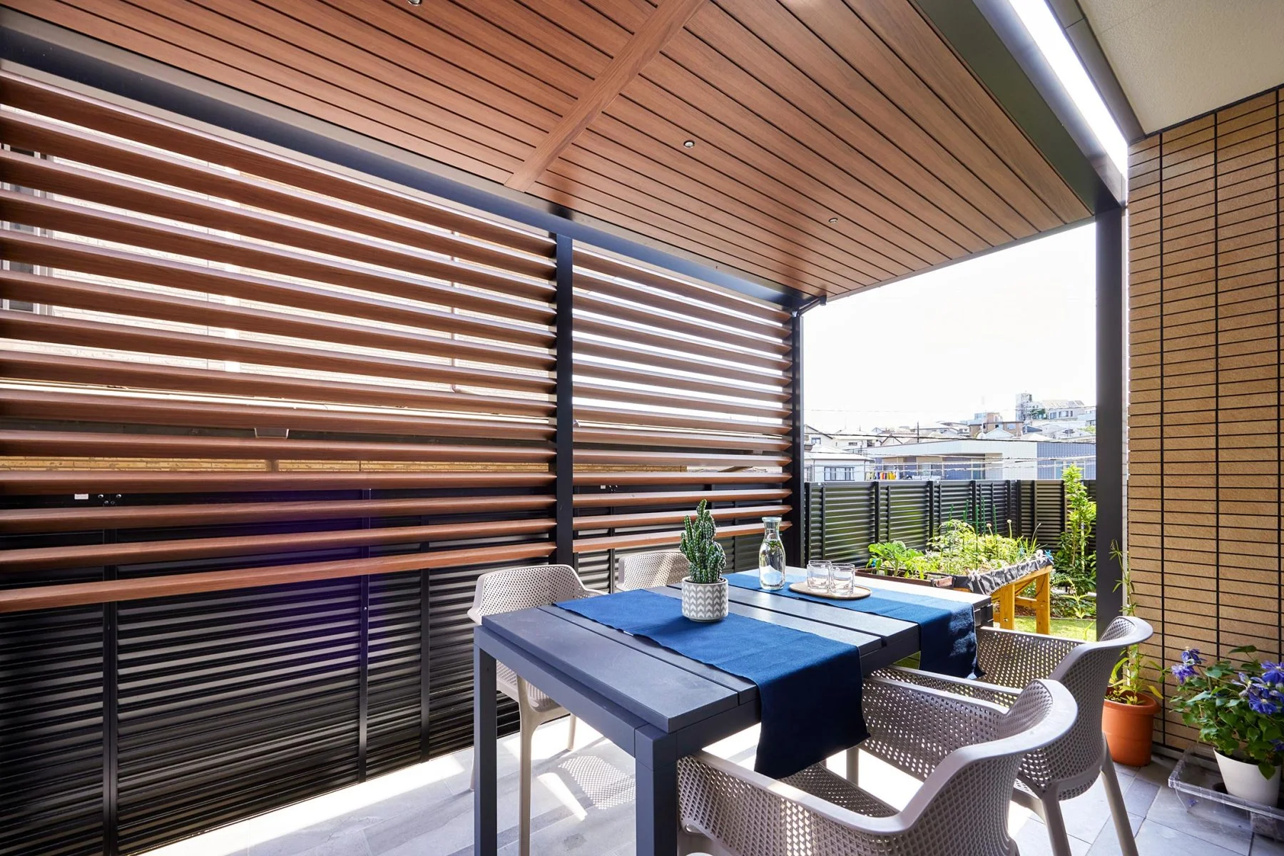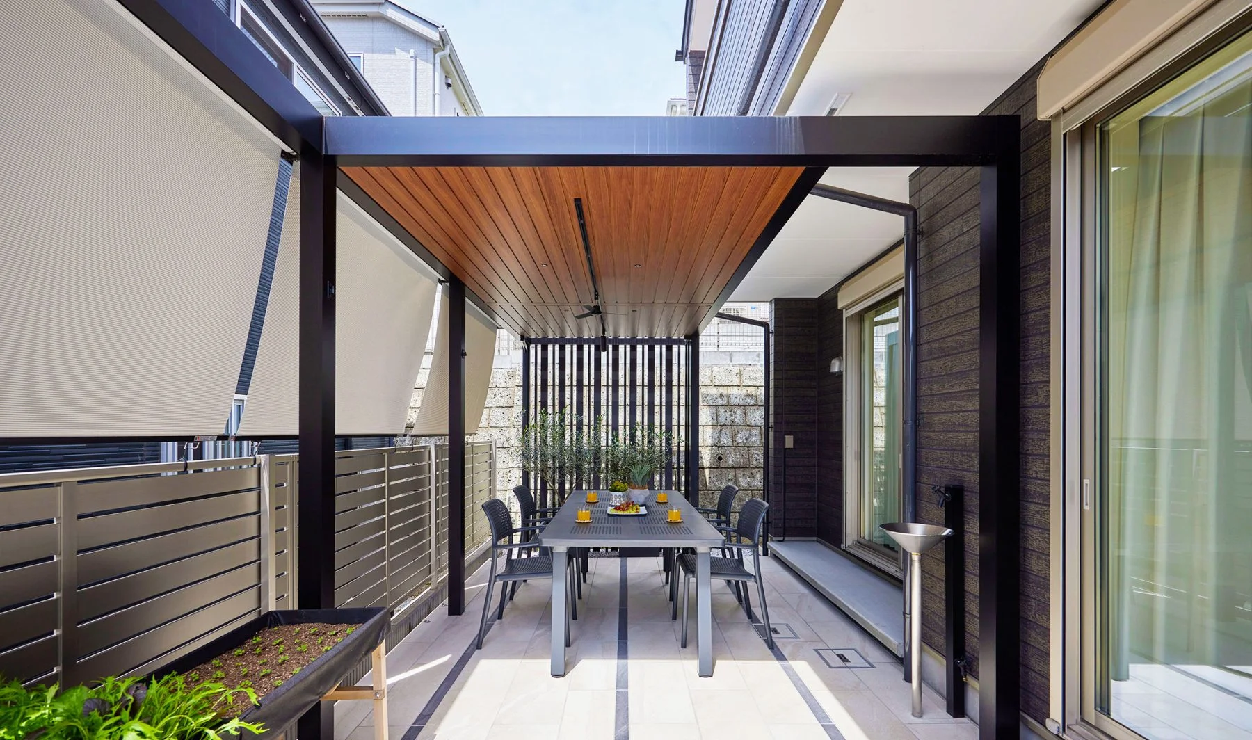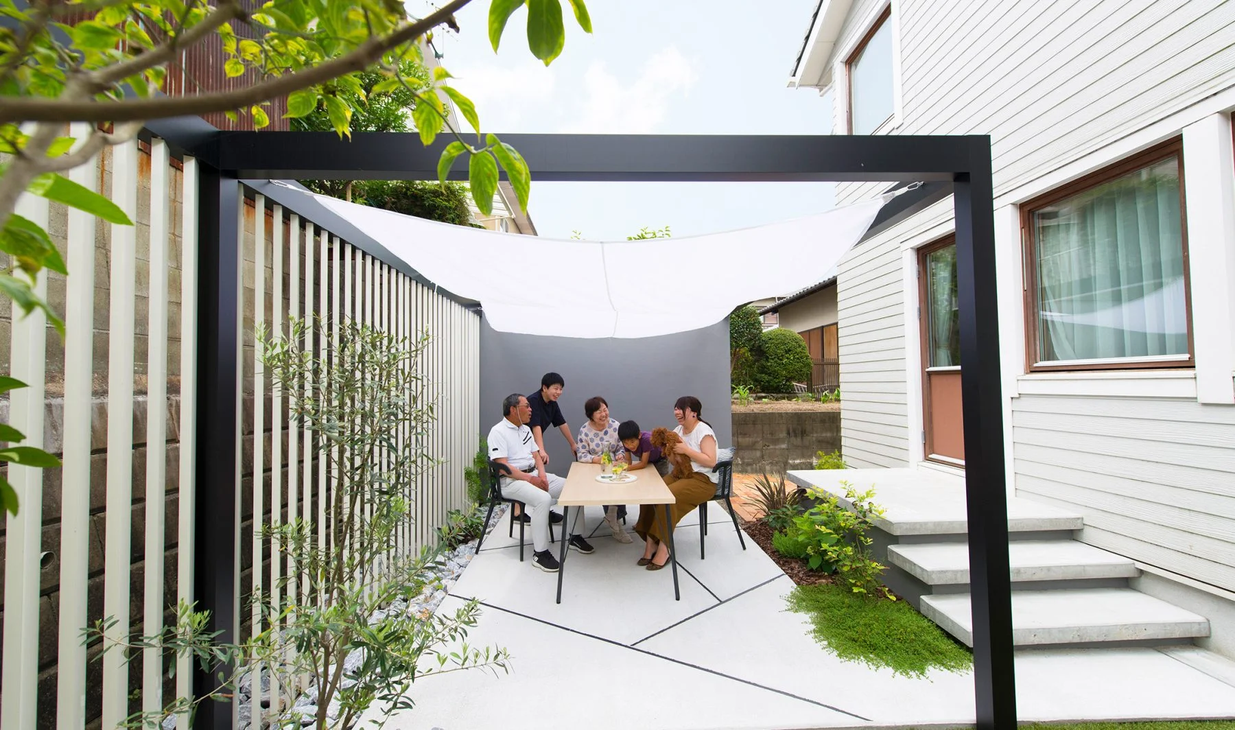 冬は特に「2階や隣家の窓から見下ろされる」というお悩みが増える季節。そんな“上からの視線”に効果的なのが、シェードやオーニングです。柔らかく屋根のように広がる布が視線をやさしく遮り、夏の日よけや急な雨にも対応できるため、年間を通して活躍します。庭やテラスをより快適な憩いの場に変えてくれるアイテムです。