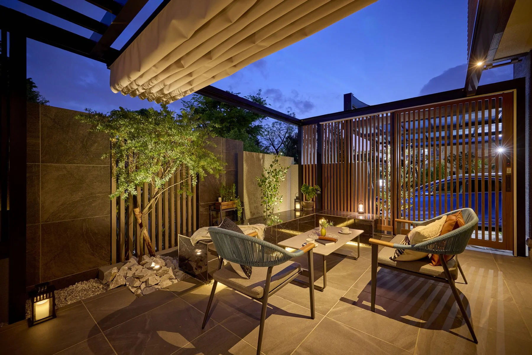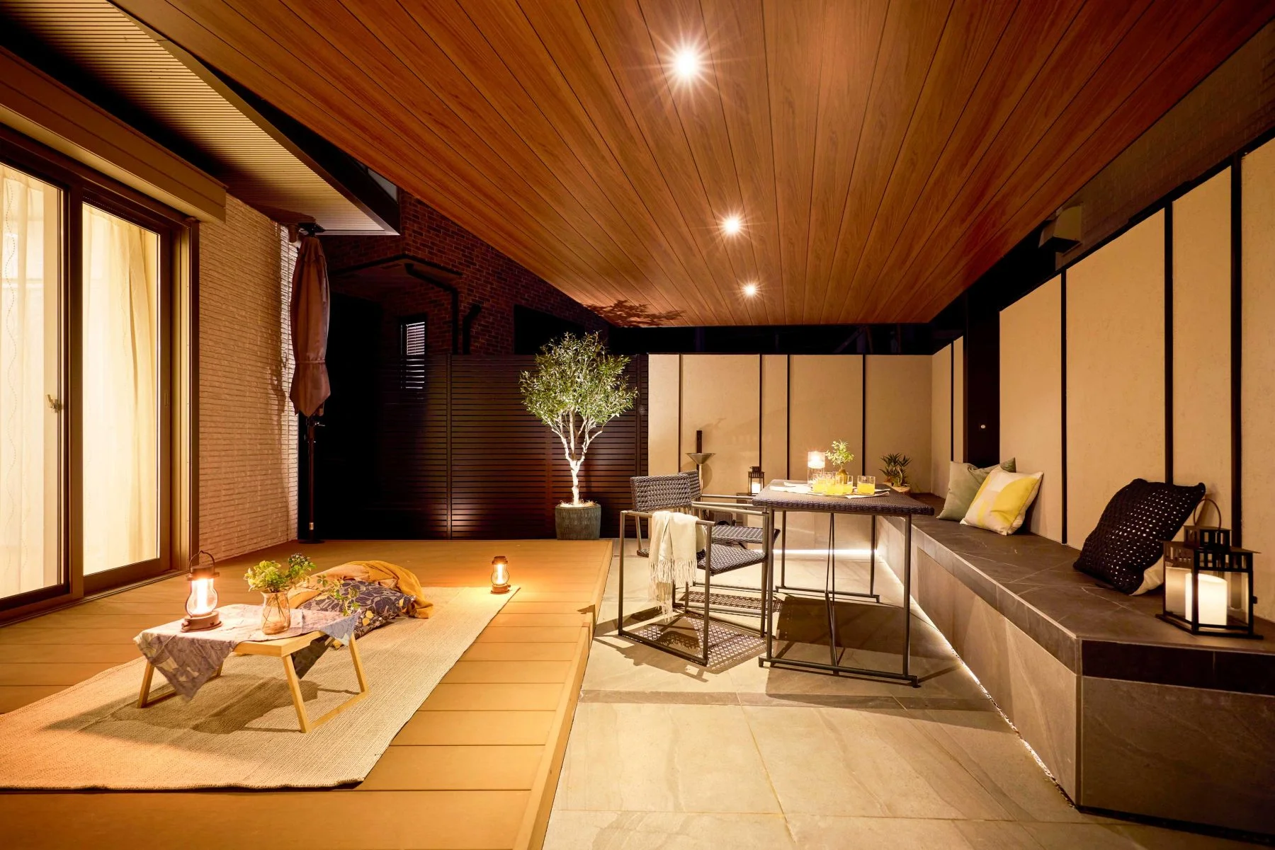 フレームを設置し、タープやシェードを組み合わせることで、まるで庭に“外のリビング”が生まれます。上からの視線を遮るだけでなく、ホームパーティー時には特別感のある空間を演出。夜のライトアップとも相性がよく、冬の澄んだ空気の中で過ごす時間が格別に感じられます。