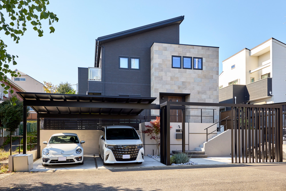 敷地の高低差と広い間口を生かしながら整えることをテーマに設計しました。高低差に合わせてカーポートを配置し、その高さに合わせてフレームの水平ラインをそろえることで、広さを生かした統一感のある外観をつくり出しています。