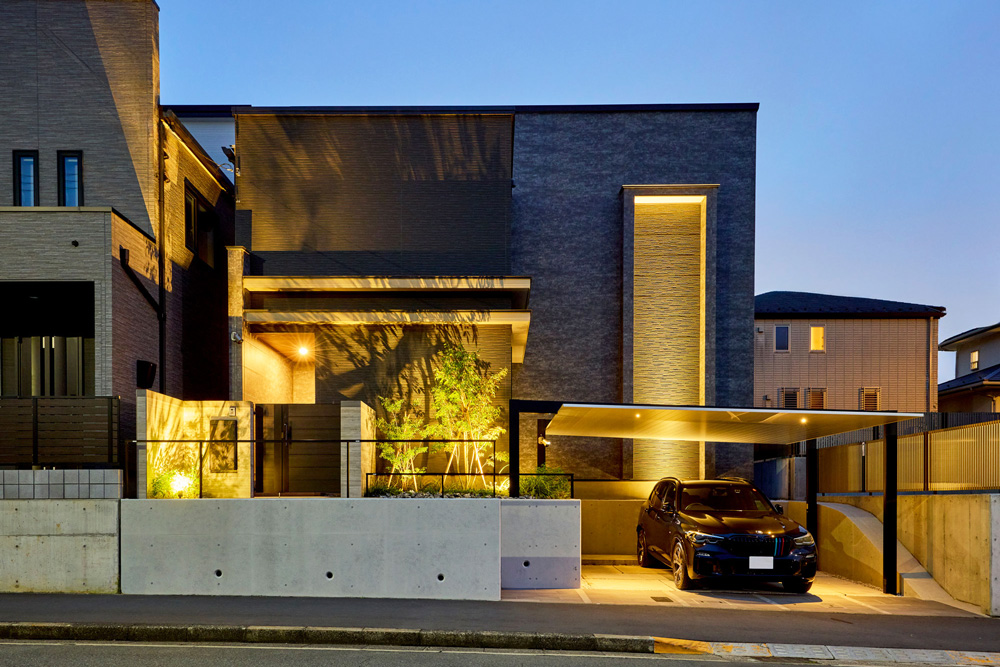 建物と調和するシンプルかつ洗練されたカラーリングで、道路と玄関の高低差をスムーズにつなぐ階段アプローチを設置。夜にはライトアップが幻想的な雰囲気を演出し、帰宅時に心が安らぐ理想の空間が完成しました。