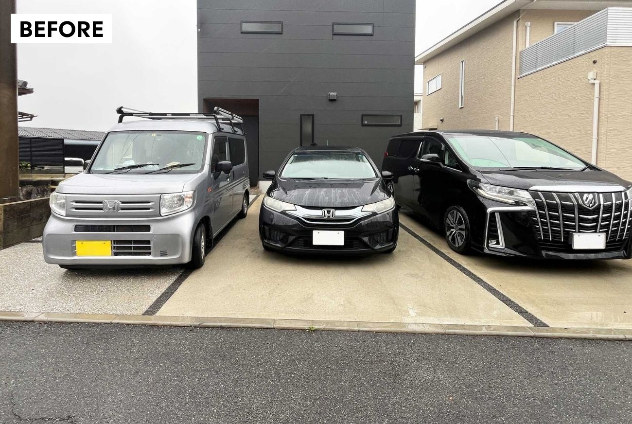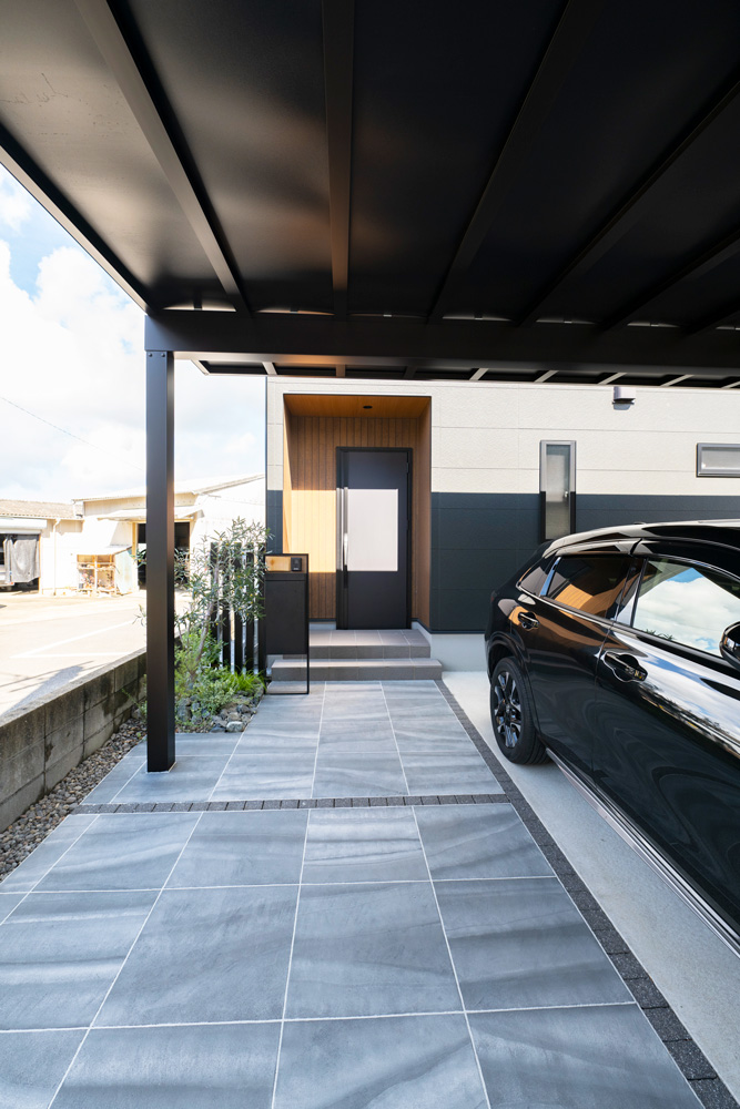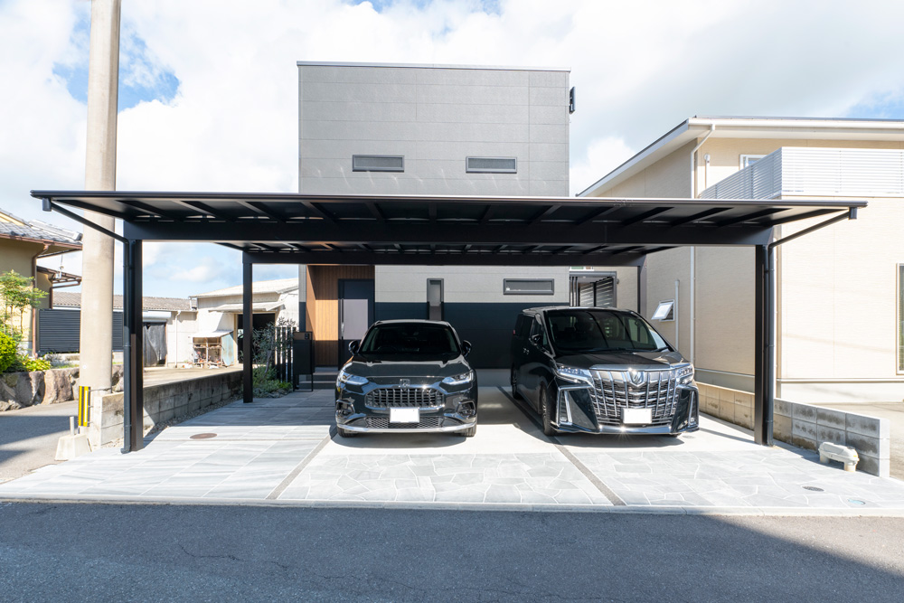 ファサードには3台用カーポートを設置し、建物に負けないダイナミックな印象を演出しました。車だけでなく自転車も屋根の下に収めることができ、雨の日でも濡れずに玄関まで移動できる、実用性の高い計画となっています。