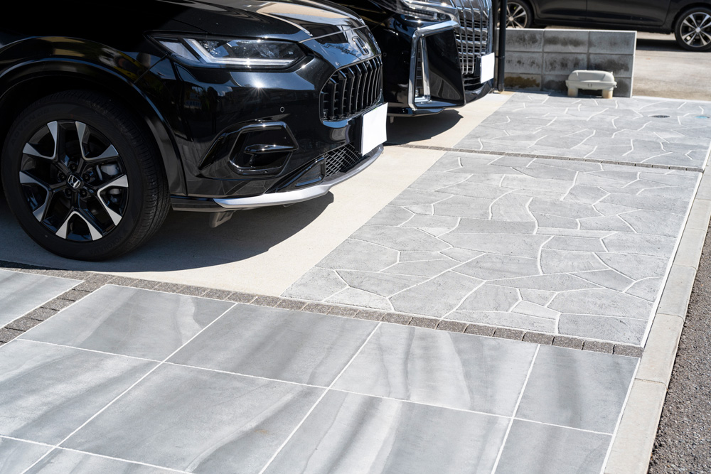 アプローチ部分は、お施主様が気にされていた既存の洗い出し仕上げを、ローラーストーンで造形・デザインを施し上塗りすることで解決しました。2種類のデザインを使い分けることで、タイヤ痕が目立ちにくく、暗めの外壁とも調和した引き締まった高級感のある印象に仕上げています。門柱は動線を妨げない位置に配置し、シンボルツリーを添えることで自然と空間に馴染ませました。