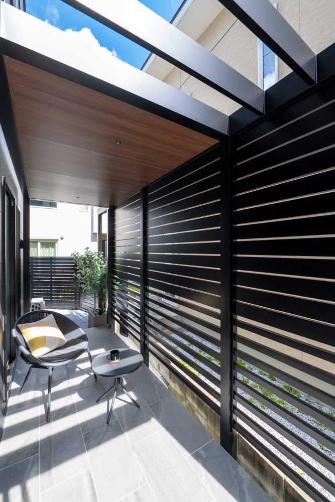 お庭は曲線を含む変形地ですが、その形状を感じさせないすっきりとしたテラス空間を計画。プラスGの屋根と目隠しフェンスでプライバシーを確保しつつ、パーゴラを組み合わせることで、明るさを保ちながら日差しをやわらかく調整しています。道路側からの視線はスタイルシェードとデザイン格子で遮り圧迫感のない落ち着いた外構空間を実現しました。